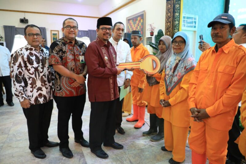 Aceh Utara – Penjabat Bupati Aceh Utara Azwardi, AP, MSi, menyerahkan bantuan berupa 10 unit rumah duafa dan 283 paket Sembako kepada tenaga kontrak kebersihan, Jumat, 14 April 2023.