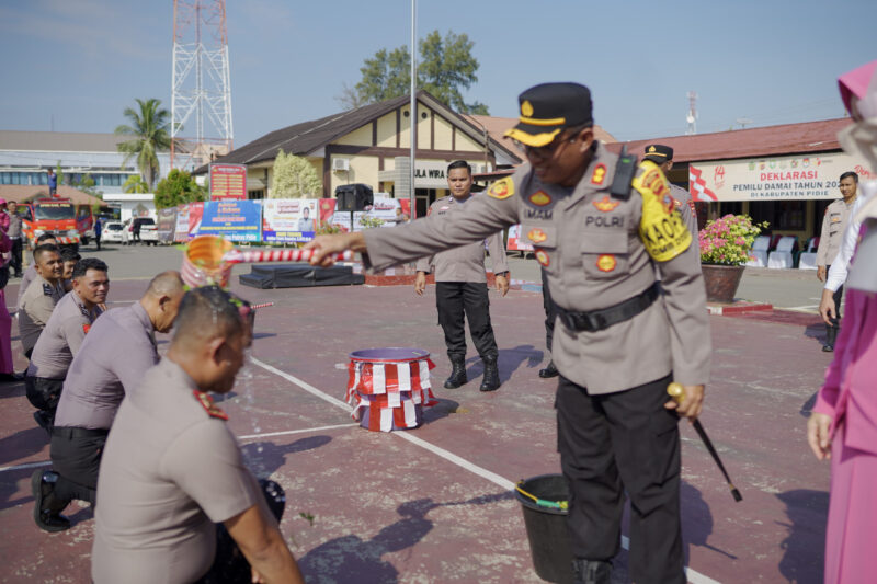 Upacara laporan kenaikan pangkat personel Polres Pidie dipimpin Kapolres Pidie AKBP Imam Asfali, selaku Inspektur upacara, Kabag SDM AKP Immarsal, SE selaku Perwira upacara dan Kapolsek Kembang Tanjong Ipda Muslim selaku komandan upacara.