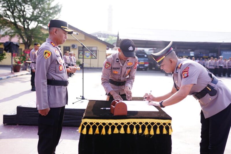 Kapolres Pidie AKBP Imam Asfali, SIK memimpin upacara serah terima jabatan Kasat Binmas Polres Pidie yang berlangsung di lapangan apel Mapolres Pidie, Jumat, (14/4/2023)