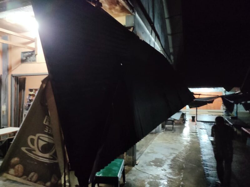Aceh Utara – Empat unit rumah toko (ruko) berkonstruksi semi permanen rusak setelah angin kencang dan hujan deras di Desa Keude Bungkah, Kecamatan Muara Batu, Aceh Utara, wilayah hukum Polres Lhokseumawe, Sabtu (10/6/2023) malam.