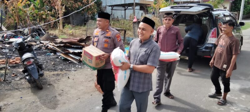 Lhokseumawe – Kapolsek Banda Sakti Iptu Faisal, SH menyerahkan bantuan Sembako kepada korban rumah terbakar di Desa Mon Geudong dan Gampong Jawa Baru, Kecamatan Banda Sakti, Kota Lhokseumawe.