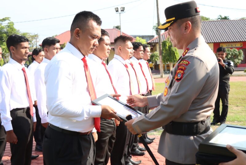 Aceh Utara- Kapolres Aceh Utara AKBP Deden Heksaputera S, S.I.K memberikan penghargaan kepada belasan personelnya terdiri dari Satuan Reserse Kriminal (Reskrim) dan Satuan Reserse Narkoba atas keberhasilan dalam pengungkapan kasus.