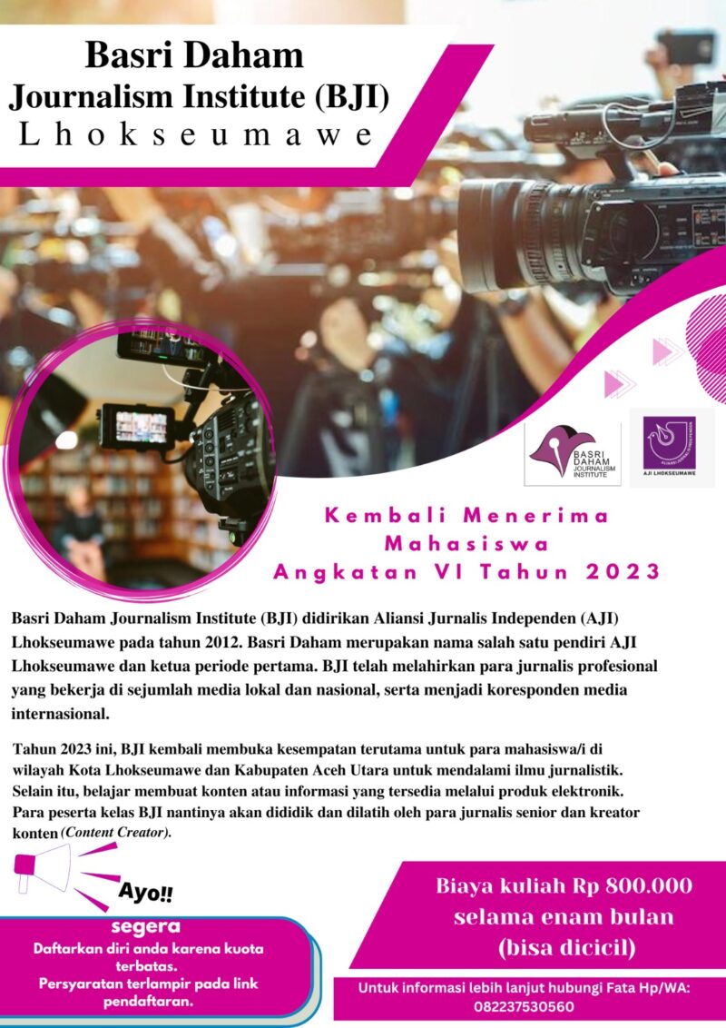 Lhokseumawe – Basri Daham Journalism Institute (BJI) Aliansi Jurnalis Independen (AJI) Kota Lhokseumawe kembali membuka penerimaan calon mahasiwa baru angkatan VI tahun 2023.
