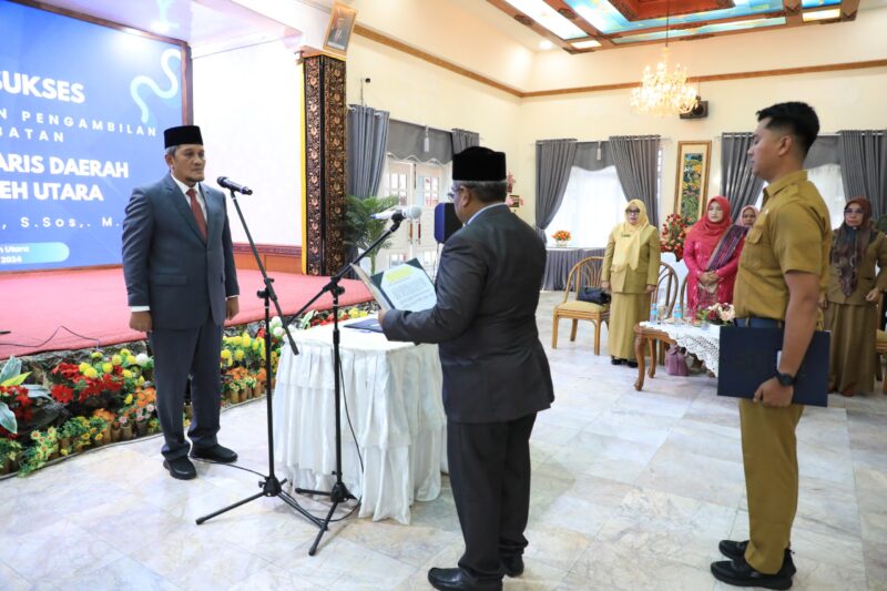Aceh Utara – Penjabat Bupati Aceh Utara Dr Mahyuzar, MSi, melantik dan mengambil sumpah Dayan Albar, SSos, MAP, sebagai Penjabat Sekretaris Daerah setempat, di Pendopo Bupati, Selasa sore, (30/1/2024).