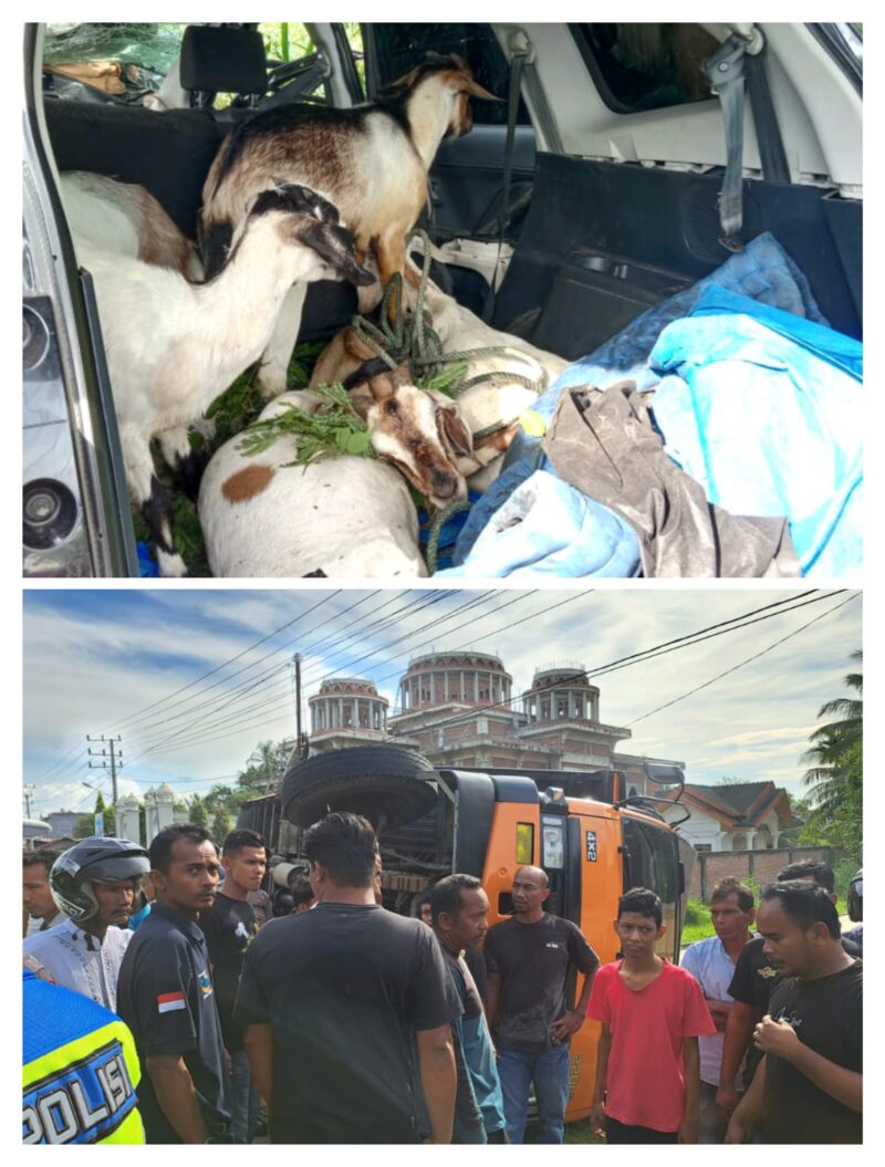 Lanjut Kasat, Truk Fuso yang melaju dari arah Medan menuju Banda Aceh, setiba di TKP dari arah berlawanan datang  Terios yang diindikasi kawanan pencuri kambing dan mereka menuju Medan dengan kecepatan tinggi sehingga hilang kendali dan menabrak bagian ban belakang sebelah kanan Truk Fuso tersebut. Sehingga ban Truk Fuso terlepas dan terbalik kekiri jalan. “Tapi dalam mobil terios terdapat kambing,”tegas Kasat.