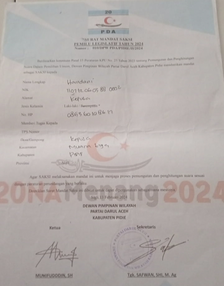“Mereka terbukti bahwa benar saksi Parpol karena saat pemilihan Caleg Pemilu 2024, pernah menyerahkan surat mandat kepada PPS dan KPPS gampong setempat,” kata ZA.