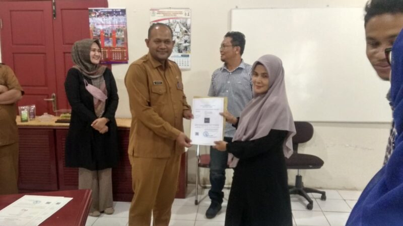 Aceh Utara.Thetime23.com. Kepala Dinas Perdagangan, Perindustrian, Koperasi dan UKM Kabupaten Aceh Utara, Iskandar, S.STP.,M.SP, menyerahkan sertifikat merek dagang untuk 17 Industri Kecil dan Menengah (IKM), Senin (20/3/2023).