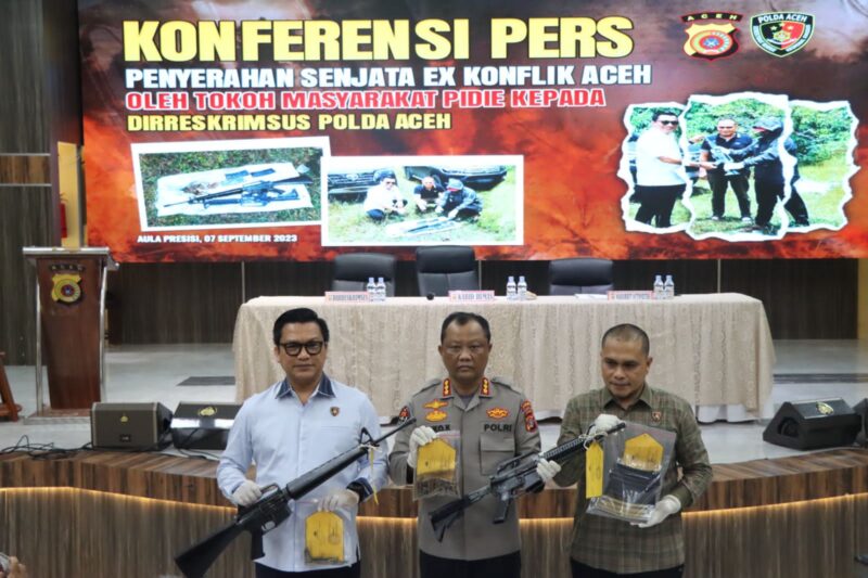“Dua pucuk M-16 yang diserahkan oleh tokoh masyarakat—namanya minta dirahasiakan—di Pidie masih aktif,” ungkap Winardy dalam konferensi pers di Polda Aceh, Kamis, (7/9/2023).