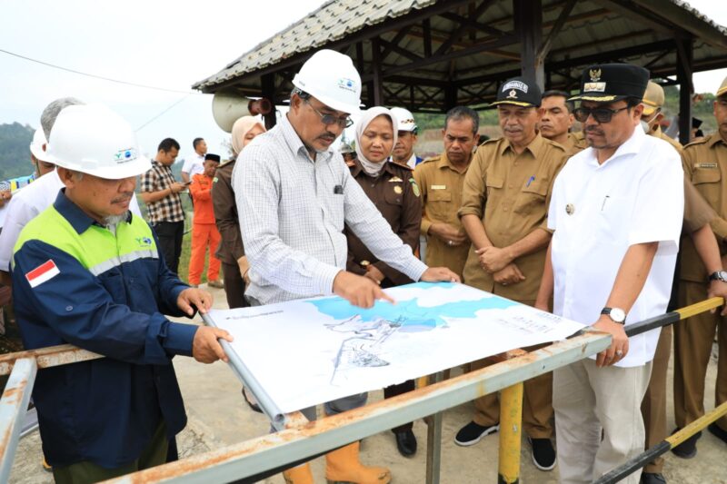 Kunjungan Pj Bupati Aceh Utara Azwardi dan rombongan ke lokasi pembangunan waduk Keureutoe disambut langsung oleh manajer lapangan PT Brantas Abipraya.