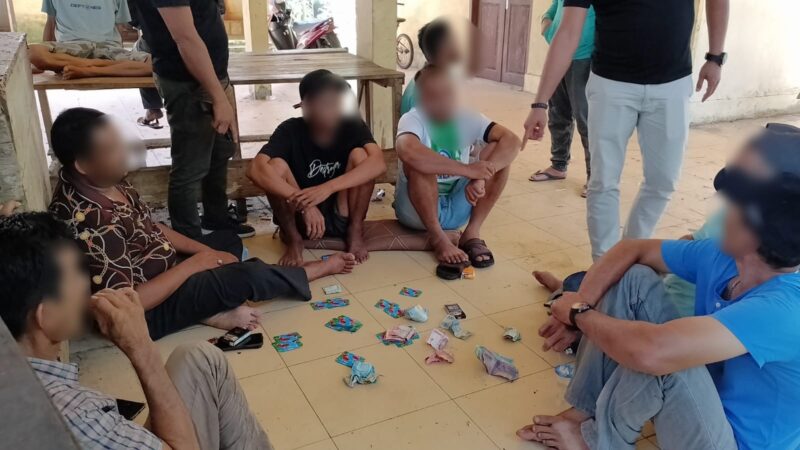 Nagan Raya – Personel Satreskrim Polres Nagan Raya menggerebek lokasi perjudian di Pasar Ikan Desa Kuta Baroe, Kecamatan Seunagan, Kabupaten Nagan Raya, Selasa, (23/4/2024). Dalam penggerebekan itu, polisi menangkap tujuh pelaku dan mengamankan barang bukti uang jutaan rupiah.