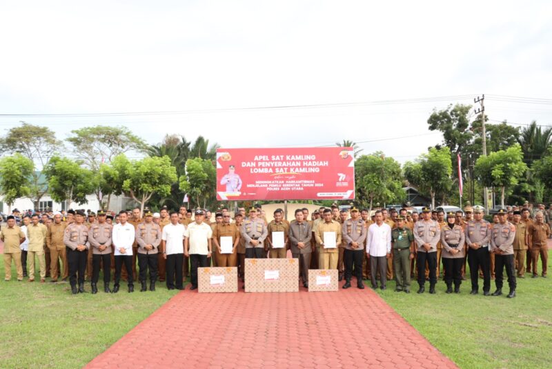 Aceh Utara – Polres Aceh Utara menggelar Apel Satkamling 2023, dipimpin Kapolres AKBP Deden Heksaputera S, S.I.K, disertai penyerahan hadiah kepada tiga pemenang lomba Pos Satkamling tingkat Polres, berlangsung di halaman Mapolres setempat, Rabu (21/6/2023).
