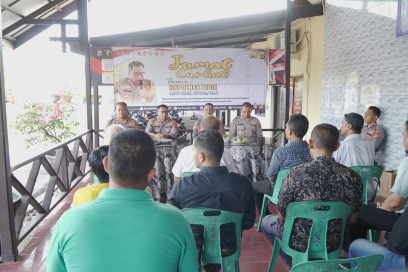 Sigli – Polres Pidie menggelar Jumat Curhat dan silaturahmi sekaligus memperkenalkan Polisi Rukun Warga, (RW), ke masyarakat Kecamatan Kota Sigli, Kabupaten Pidie, Jumat (9/6/23).