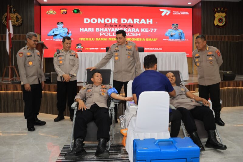 Banda Aceh – Kapolda Aceh Irjen Ahmad Haydar meninjau langsung pelaksanaan kegiataan bakti kesehatan berupa donor darah di Gedung Presisi Polda Aceh, Kamis, (15/6/2023).