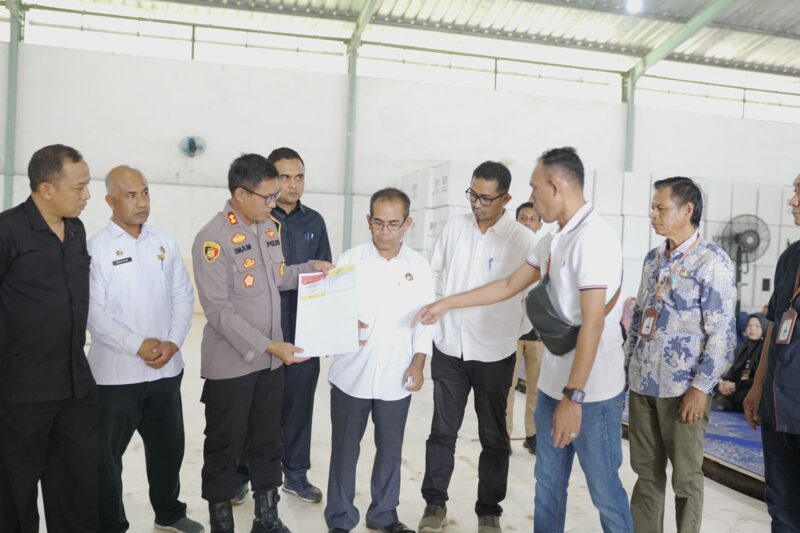 Sigli – Kapolres Pidie AKBP Imam Asfali, SIK, MH meninjau proses pelipatan surat suara di gudang logistik Komisi Independen Pemilihan (KIP) Pidie, Rabu (10/1/2024)