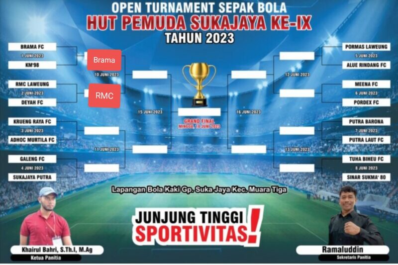 Sigli – Tuan rumah Suka Jaya Putra harus bermain taktis saat menghadapi Galeng FC Leungah Aceh Besar pada laga hari ke empat Turnamen HUT Pemuda Suka Jaya ke IX di lapangan Gampong Suka Jaya, Kecamatan Muara Tiga Kabupaten Pidie, Minggu, (4/6/2023).