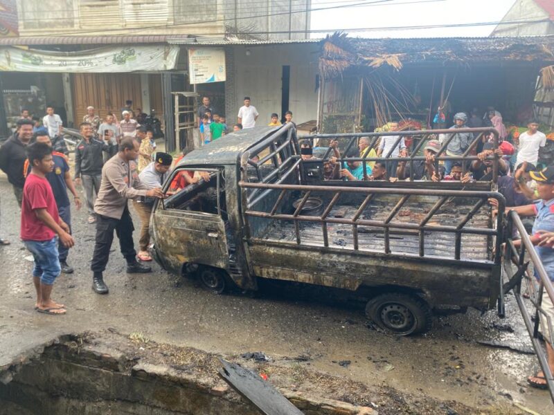 Lhokseumawe- Satu unit mobil pick-up jenis Suzuki Carry alami kebakaran secara tiba-tiba saat melintas di kawasan Dusun Paya Lhok, Desa Paya Punteut, Kecamatan Muara Dua, Kota Lhokseumawe. Sebuah kedai juga ikut terbakar dalam peristiwa, Jumat (7/4/2023), sekira pukul 15.45 WIB.