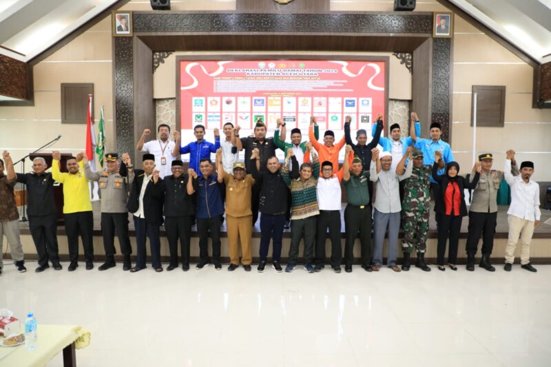 Aceh Utara – Pemerintah Kabupaten Aceh Utara bersama para pimpinan Partai Politik (Parpol) peserta Pemilu 2024 dan jajaran Forkopimda setempat, menggelar acara Deklarasi Pemilu Damai untuk pemilihan legislatif, Presiden/Wakil Presiden, Gubernur/Wakil Gubernur, dan Bupati/Wakil Bupati, berlangsung di aula Kantor Bupati Aceh Utara di Landing, Kecamatan Lhoksukon, Selasa, (5/9/2023).