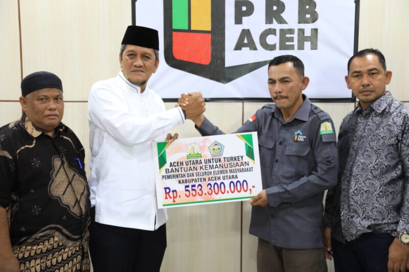 Aceh Utara- Penjabat Bupati Aceh Utara diwakili Asisten I Setdakab Dayan Albar menyerahkan sumbangan kemanusiaan untuk bencana gempa di Turki dan Suriah Rp.553.300.000 dan diterima Ketua Forum Pengurangan Resiko Bencana (PRB) Aceh Muhammad Hasan, di Kantor Badan Penanggulangan Bencana Aceh (BPBA) di Banda Aceh, Selasa, (11/4/2023).