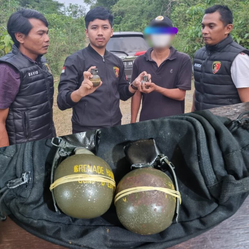 Banda Aceh – Seorang petani di Pidie berinisial DG (38) menyerahkan dua butir granat aktif kepada personel Polres Pidie di Kawasan pinggir hutan Gampong Lala, Kecamatan Mila, Kabupaten Pidie, Kamis, (13/4/2023).