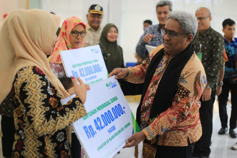 Aceh Utara – Penjabat (Pj) Bupati Aceh Utara, Dr. Drs. Mahyuzar MSi secara simbolis menyerahkan santunan kematian dan beasiswa dari BPJS Ketenagakerjaan Lhokseumawe kepada sejumlah keluarga aparatur gampong yang meninggal dunia, Kamis, (7/12/2023).