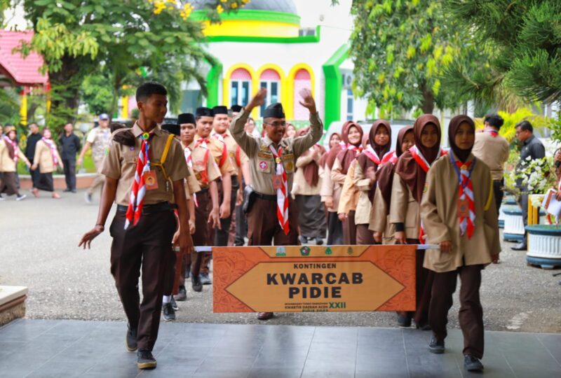 Bersama forkopimda Kabupatrn Pidie Pj Bupati menyambut peserta pawai Tlta’aruf MTR Gerakan Pramuka Kwartir Daerah Aceh Ke-XXII Kabupaten Pidie Tahun 2023 bertempat di Pendopo Bupati Pidie, Senin (3/4/2023).