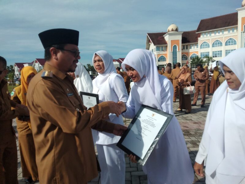 Aceh Utara – Penjabat Bupati Aceh Utara Azwardi, AP, MSi, menyerahkan penghargaan untuk delapan orang tenaga kesehatan teladan, serta untuk gampong dan pembina gampong yang dinilai berprestasi, berlangsung usai apel gabungan di lapangan upacara depan Kantor Bupati di Landing, Kecamatan Lhoksukon, Senin, 5 Juni 2023.