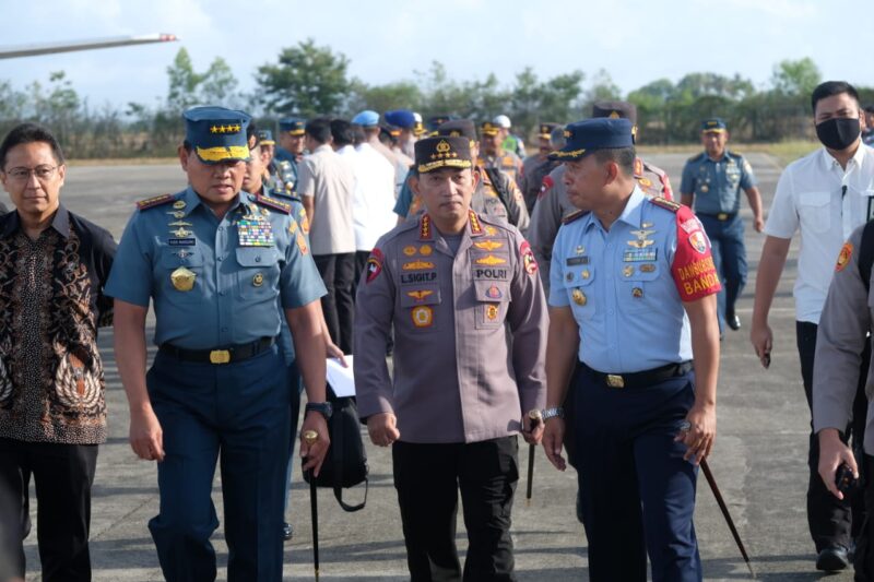 Banda Aceh – Kapolri Jenderal Listyo Sigit Prabowo dan Panglima TNI Laksamana Yudo Margono tiba di Bandara Sultan Iskandar Muda (SIM) Blang Bintang, Aceh Besar. Kedatangan pimpinan TNI dan Polri itu disambut Kapolda Aceh Irjen Ahmad Haydar, Selasa, (27/6/2023).