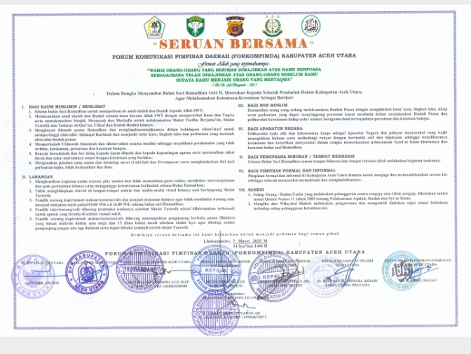 Aceh Utara.Thetime23.com. Forum Komunikasi Pimpinan Daerah (Forkompimda) Kabupaten Aceh Utara mengeluarkan seruan bersama dalam rangka menghadapi dan menjalankan Ramadhan 1444H/2023M.