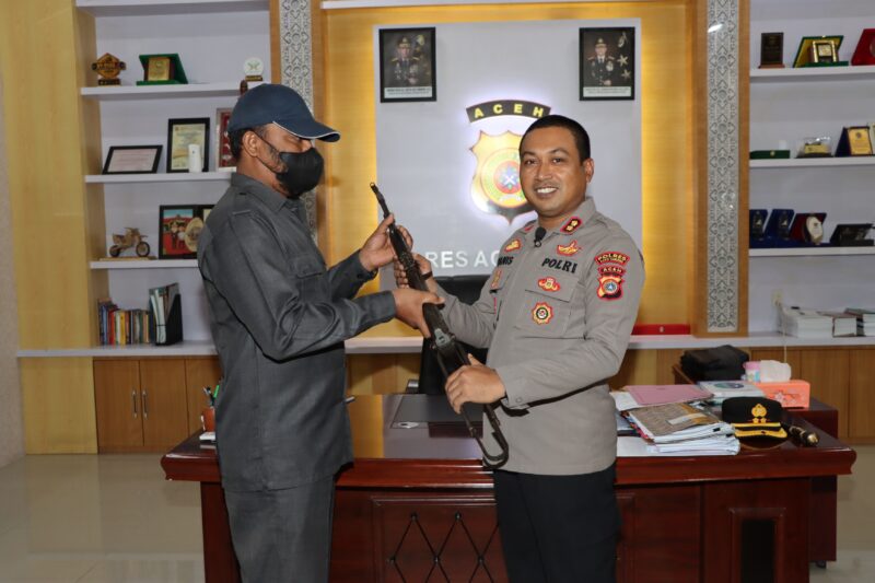 Kapolres Aceh Tamiang AKBP Muhammad Yanis yang menerima langsung senjata api laras panjang jenis AK-56 peninggalan masa konflik.