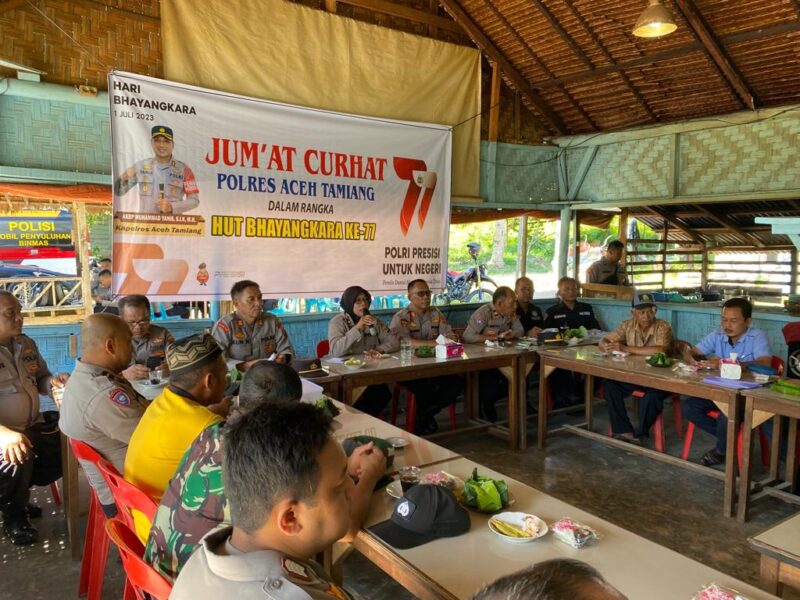 Curhat Polres Aceh Tamiang bersama Polsek Kejuruan Muda kali ini dalam rangka hari ulang tahun (HUT) Bhayangkara ke 77 diikuti Tomas, Toga, dan Todat serta masyarakat dalam kecamatan setempat.